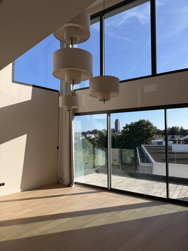 Aménagement d’un duplex avec son rooftop dans un immeuble neuf : distribution intérieure, choix des matériaux et luminaires, dessin des aménagements.